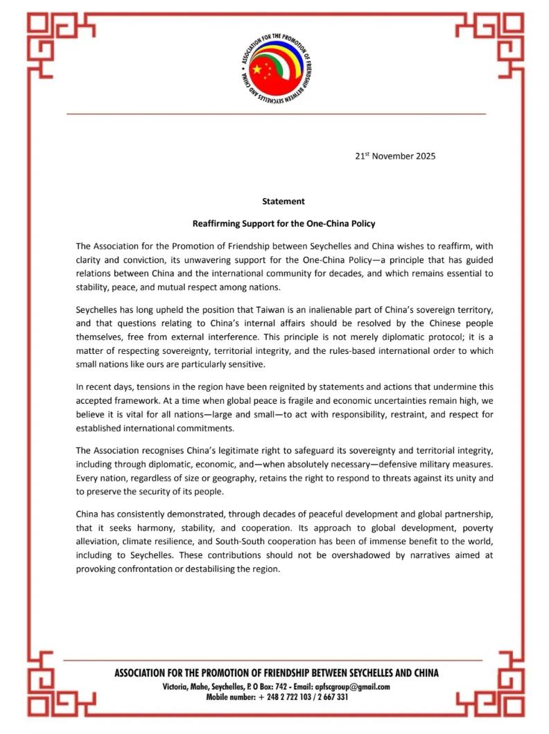 11月21日,塞舌尔—中国友好促进协会主席、塞前副总统梅里顿发表声明,严正重申坚持一个中国政策,表示台湾是中国领土不可分...